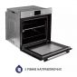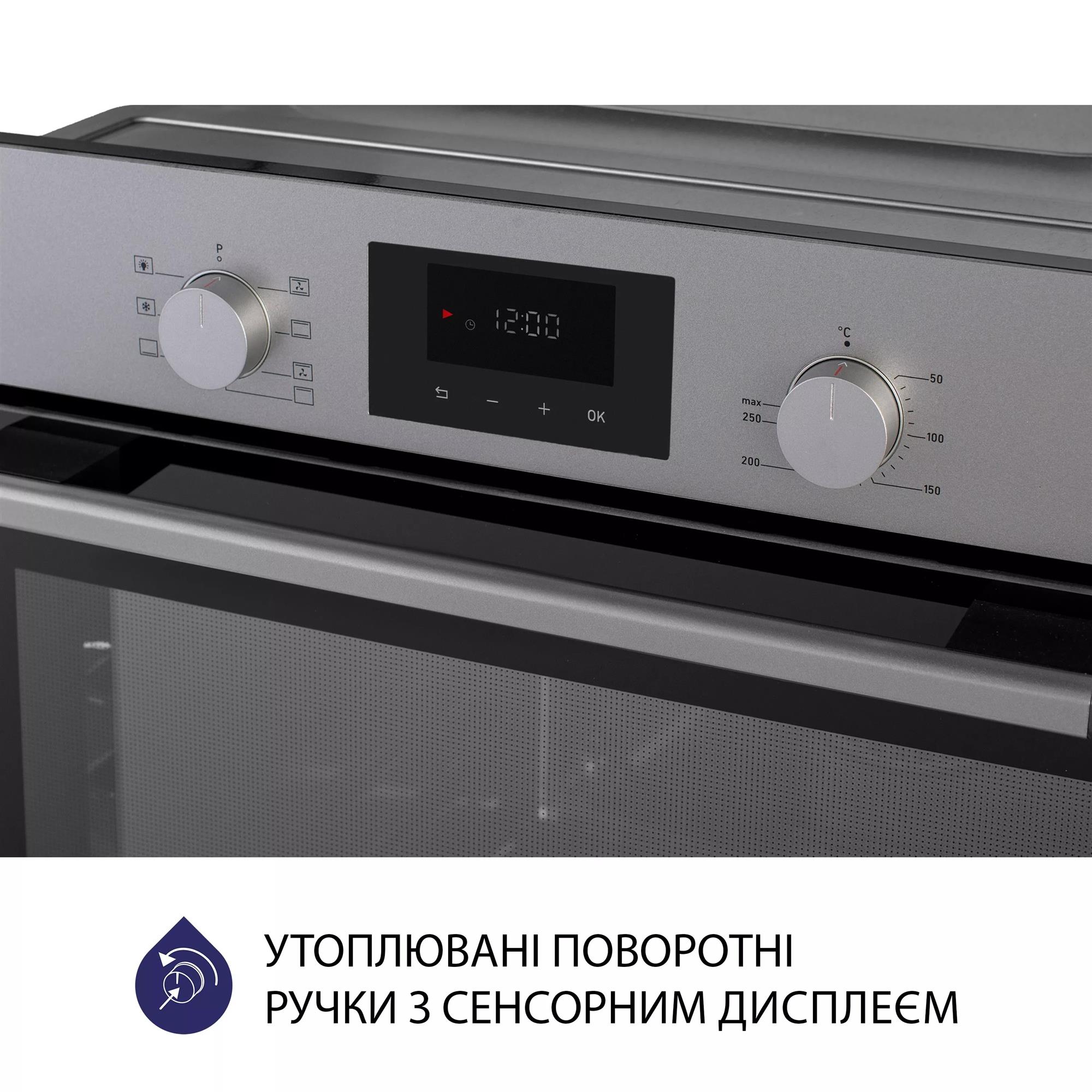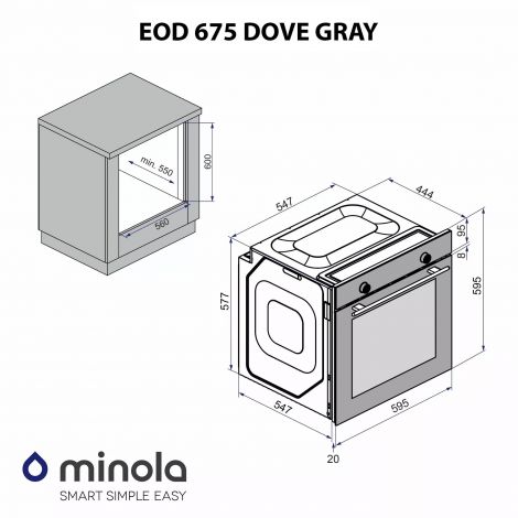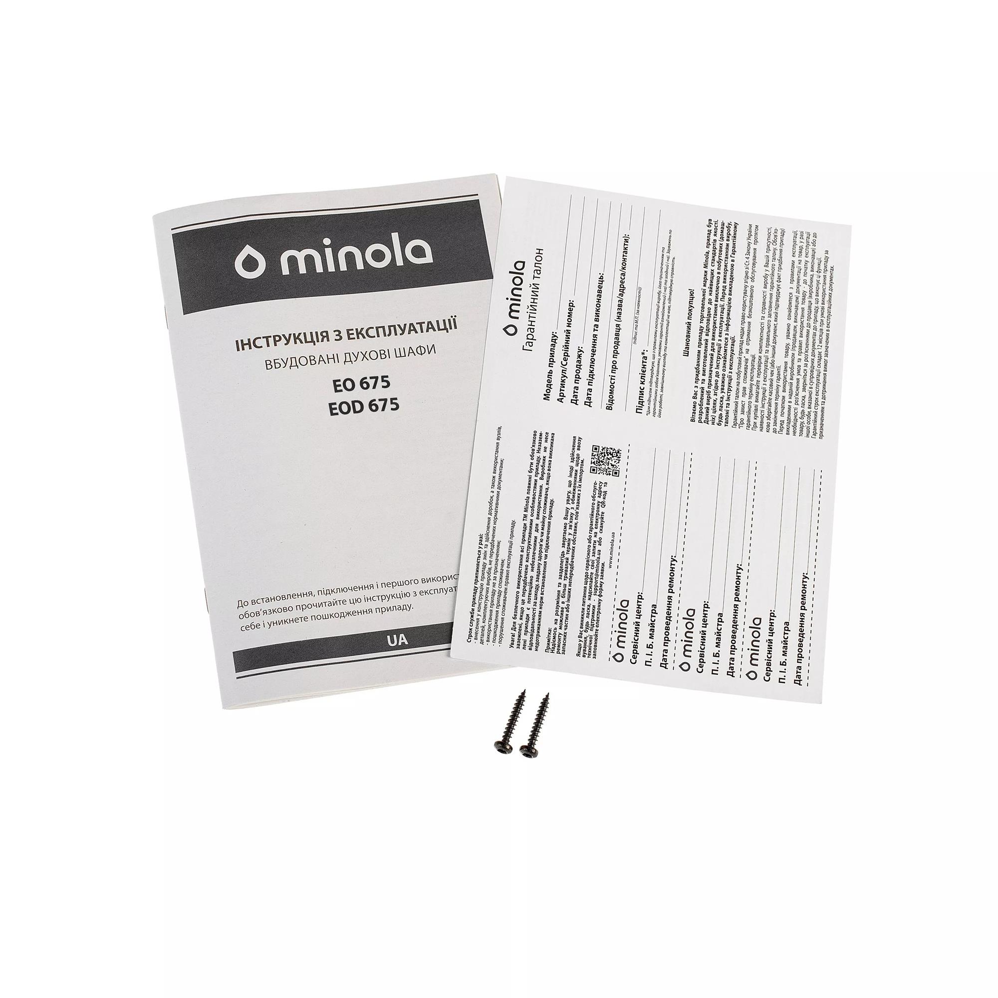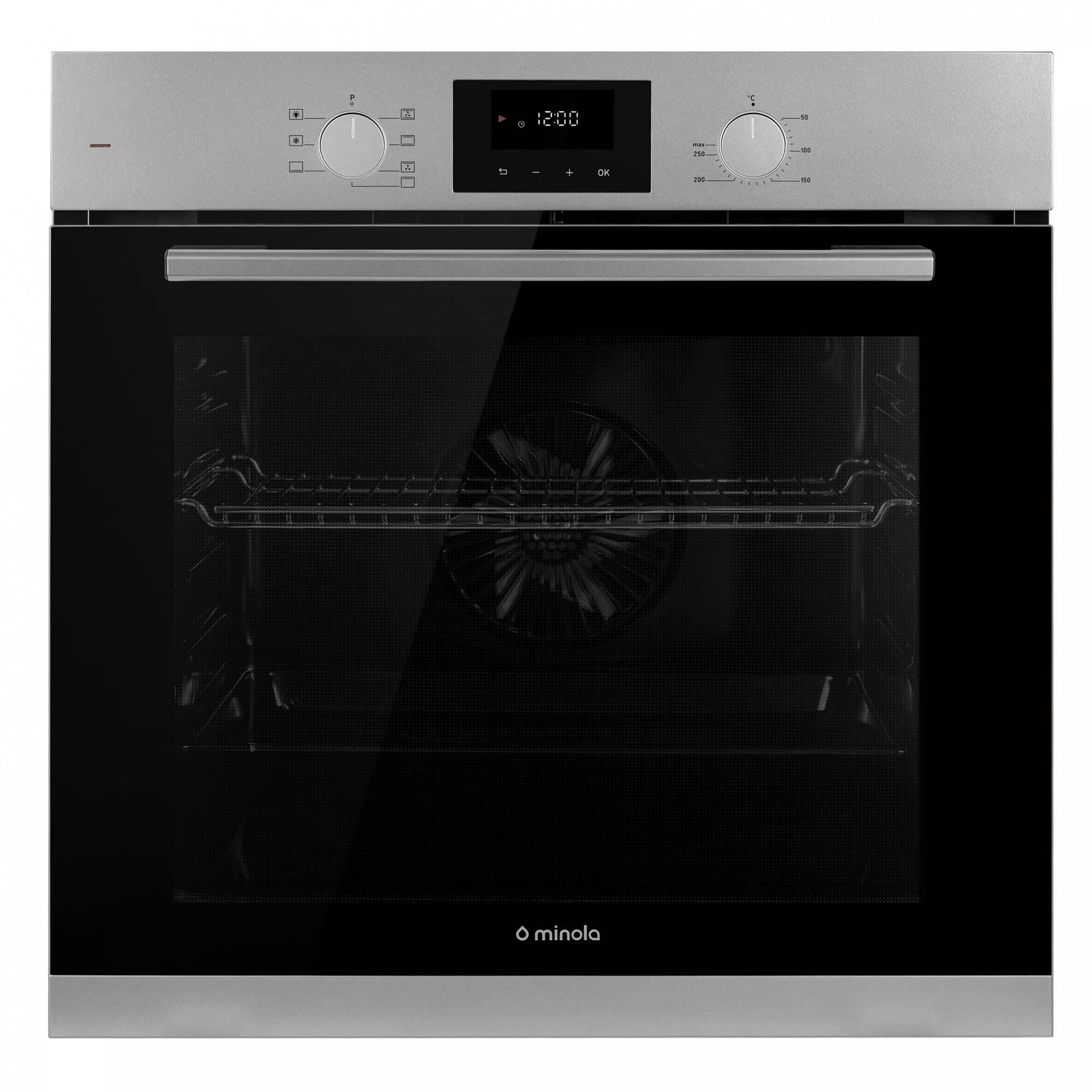 Електрична духова шафа Minola EOD 675 — втілення сучасних технологій Вбудована духова шафа поєднує в собі стильний зовнішній вигляд, зручність у використанні та мультифункційність. 7 найбільш необхідних режимів для приготування Модель має 7 різних програм для реалізації різноманітних рецептів. Додаткові функції духової шафи включають конвекцію й таймер, що дозволяє вам налаштовувати час і температуру для оптимального приготування. Окрім того, модель доповнена системою тангенціального охолодження. Воно виводить зайве тепло за допомогою вентилятора та захищає меблі від впливу конденсату. Корисний об’єм внутрішньої камери та покриття Easy Clean Простора внутрішня камера об’ємом 72 л вкрита інноваційною антипригарною емаллю. Вона забезпечує легке очищення від жирів та інших забруднень. Очищення відбувається наступним чином: налийте воду у деко, увімкніть нижній нагрів та встановіть температуру на 100 °C. Утворена пара розщеплює жир та бруд всередині камери, а залишки можна протерти губкою, використовуючи звичайні миючі засоби без абразивів. 5 рівнів рельєфних напрямних і аксесуари в комплектації Модель укомплектована універсальним деком, решіткою та обладнана п’ятьма рівнями напрямних. Вони дозволяють регулювати відстань між стравами, забезпечують рівномірне приготування та надійне положення аксесуарів. Залежно від технології готування страв, ви можете обирати потрібний рівень напрямних або готувати декілька страв одночасно. Дверцята з подвійним склінням від провідного бренду SCHOTT Дверцята духової шафи мають подвійне скло від німецького бренду SCHOTT, яке забезпечує ефективну термоізоляцію. Воно зберігає тепло всередині камери, знижує споживання електроенергії та захищає від опіків. Скло можна легко вилучити. Просто натисніть спеціальні кнопки з обох боків дверцят. Це значно спрощує процес очищення. Сучасна та мультифункційна панель управління Керування духовою шафою реалізоване у вигляді поворотних утоплюваних ручок з термостійкого пластику та сучасного дисплея. Ручки дозволяють легко та безпечно обирати режими та температуру, а дисплей — налаштовувати час, таймер та звукові сповіщення.