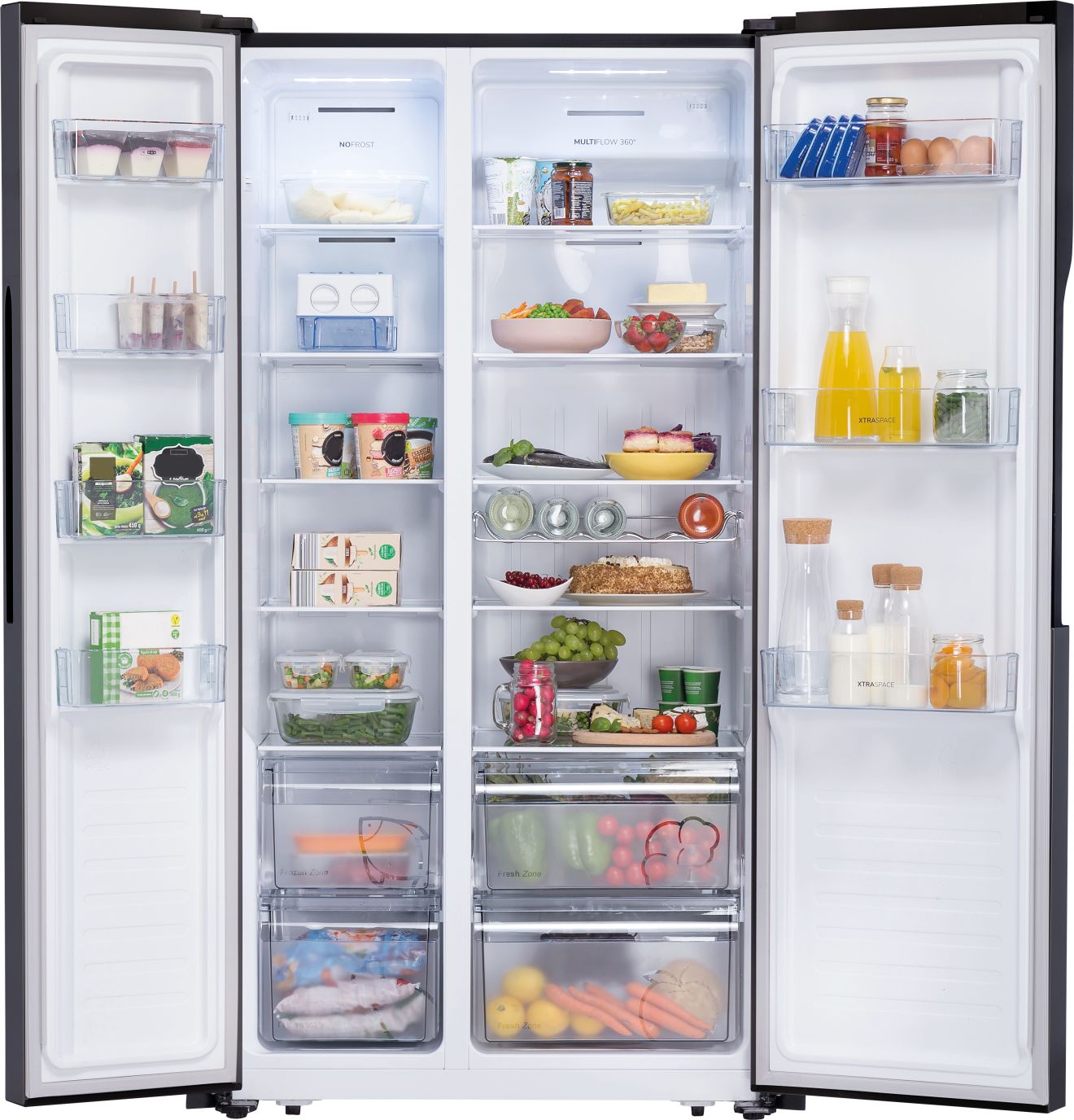 XtraSpace: больше места для хранения Практичные и просторные Продуманная организация внутреннего пространства предлагает больше места для хранения, что избавляет вас от частых походов в магазин. Продукты легко размещаются на стеклянных полках, в больших ящиках и на дверных полочках. Это значит, что вы всегда будете видеть, что у вас есть в холодильнике, и выбрасывать меньше «неликвида». NoFrost Plus Без утомительного размораживания Одна из лучших систем охлаждения на рынке, установленная в морозильной камере, предотвращает накопление слоя инея и льда и обеспечивает низкий уровень потребления энергии, в то время как в холодильном отсеке она поддерживает идеальный микроклимат для свежих продуктов. Циркуляция ионизированного воздуха предотвращает высушивание продуктов и сохраняет в них витамины и минералы. Управление SensoTech Современное управление с дисплеем Большой и наглядный дисплей позволяет быстро настраивать температуру. Функции «Быстрое замораживание» и «Отпуск» включаются одним касанием. А если температура внутри устройства по какой-либо причине повысится, об этом вас сразу предупредит сигнализация. Полка для бутылок Удобное хранение бутылок На удобной полке бутылки и банки с напитками всегда находятся под рукой и не занимают места на стеклянных и дверных полках, которое можно использовать для хранения других продуктов. Режим «Эко» Снижение энергозатрат На случай вашего длительного отсутствия можно настроить холодильник на энергосберегающий режим, так как дверца будет все время закрыта. Система MultiFlow 360° Идеальный микроклимат на каждой полке Вентиляционная система MultiFlow 360° равномерно распределяет воздух в холодильном отделении, обеспечивая оптимальную циркуляцию воздуха и наилучшие условия хранения продуктов. Инверторный компрессор Надежный, тихий и долговечный Инверторный компрессор работает тише, имеет долгий срок службы и потребляет гораздо меньше энергии по сравнению с обычным компрессором. Всякий раз, когда температура в холодильнике повышается при открывании дверцы, инверторный компрессор обеспечивает быстрое и эффективное охлаждение, чтобы предотвратить порчу продуктов.