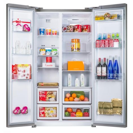 Модель имеет 2 камеры, которые располагаются Side-by-Side. Объем холодильной камеры равен 394 л, а морозильной составляет 218 л. Для хранения разных продуктов в холодильном отделении есть 4 полочки из прочного закаленного стекла, 2 ящика, а также целых 4 дверных корзины. Морозильная камера выделяется таким же набором полочек и ящиков. В сутки отделение может замораживать до 13 кг разных продуктов. При возможном отключении электричества этот холодильный агрегат может держать холод в течение 9 часов.