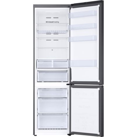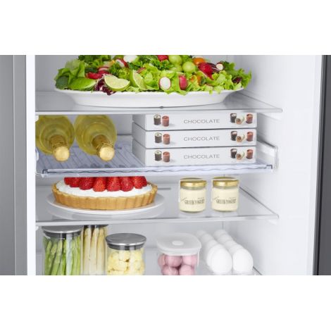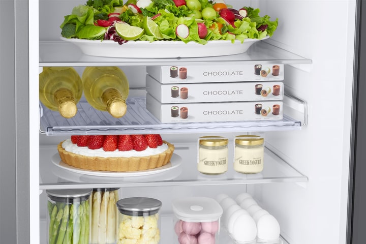 Розумно заощаджуйте енергію Зменшуйте споживання електроенергії до 10% за допомогою режиму AI Energy. Якщо ваш середній рахунок за електрику перевищує встановлену норму, цей режим допоможе вам заощадити. Режим AI Energy оптимізує швидкість компресора та цикл розморожування залежно від способу використання та навколишнього середовища. Більше простору всередині Зберігайте більше продуктів у великому холодильнику об’ємом 385 літрів. Унікальна технологія SpaceMax використовує спеціальну високоуретанову ізоляцію, яка дозволяє зробити стінки набагато тоншими, не погіршуючи при цьому енергоефективність. Таким чином, усередині стає більше простору. SmartThings вдома Керуйте споживанням енергії, щоб скоротити викиди вуглекислого газу в атмосферу та заощадити гроші. SmartThings Energy дає поради щодо енергоефективності. Він також відстежує енергоспоживання приладів у режимі реального часу та порівнює його з попереднім місяцем. Розумне обслуговування. Легкий догляд Організуйте, готуйте та купуйте їжу ефективніше. SmartThings Food дозволяє створювати список продуктів у вашому холодильнику та керувати термінами їхньої придатності, щоб ви могли перевірити, що у вас є. Він також рекомендує персоналізовані рецепти на основі ваших уподобань. Поступово охолоджує від кута до кута Гарантує, що вся ваша їжа належним чином охолоджена. Система всебічного охолодження поступово охолоджує кожне відділення від кута до кута. Вона постійно перевіряє температуру та забезпечує циркуляцію холодного повітря через оптимально розташовані вентиляційні отвори. Довговічна свіжість продуктів без утворення льоду Не витрачайте час та енергію на розморожування холодильника. Технологія No Frost покращує циркуляцію повітря для підтримки постійної температури, що запобігає утворенню льоду. Завдяки їй необхідна температура досягається набагато швидше і система охолодження працює з меншим навантаженням. Ідеальне зберігання свіжості м’яса та риби Optimal Fresh + - це окремий відсік для зберігання, який ідеально підходить для зберігання м’яса та риби. Температура там нижча, ніж у холодильнику, щоб вони залишалися свіжими та зберігали свій смак. Оптимальна вологість для тривалої свіжості Збережіть оригінальну текстуру продуктів, смак та запах протягом тривалого періоду. Скринька з контролем вологості включається простим поворотом ручки. Усередині створюються ідеальні умови для зберігання фруктів та овочів, так вони залишаються свіжими та соковитими. Швидке охолодження та заморожування за потребою Насолоджуйтесь швидким охолодженням. Одним натисканням кнопки Power Cool інтенсивно вдує холодне повітря в холодильник, щоб швидко охолодити ваші продукти чи улюблені напої. Power Freeze забезпечує швидку подачу холодного повітря до морозильної камери. Чистота, надійність та захист Очистити задню стінку холодильника набагато простіше. Захисний короб захищає кабелі і легко очищається, тому можна не переживати за комплектуючі холодильника. Відкриваються на 90°С навіть біля стіни Розмістіть холодильник у зручному для вас місці, не звертаючи уваги на стіни. Конструкція реверсивних дверей дозволяє відкривати їх на 90°С, не зачіпаючи жодну стіну. Таким чином, ви можете розмістити холодильник у зручному місці, а двері повністю відчинятимуться до рівня бічної стіни.