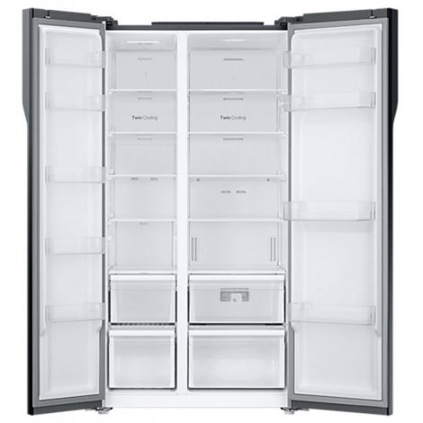 Холодильник выполнен в современном исключительном дизайне, он по праву станет функциональным украшением кухонного интерьера. Цифровой светодиодный дисплей и внутреннее Led освещение обеих камер придает комфорта в управлении и пользовании агрегатом. В холодильнике side-by-side найдется место для хранения большого количества продуктов. Внутреннее пространство располагает ударопрочными полками из закаленного стекла, выдвижными боксами и полками на дверцах.