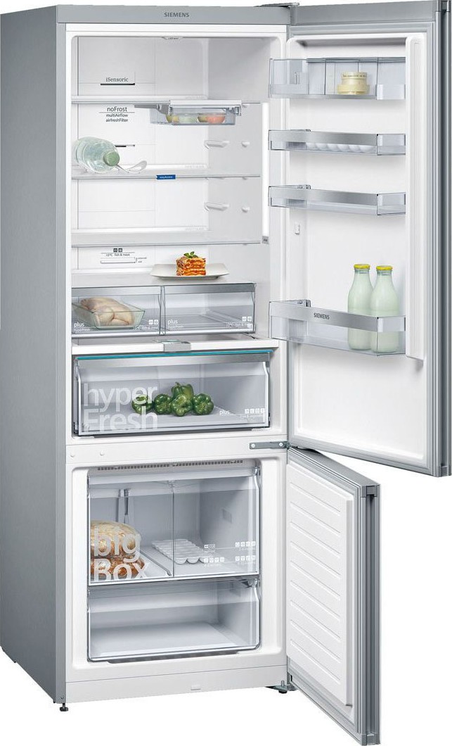 Холодильник Siemensс нижней морозильной камерой на 366 л. Система равномерного многопоточного охлаждения MultiAirflow. Технология NoFrost. Функция быстрого охлаждения Super Сooling и быстрого замораживания SuperFreezing с автоматическим отключением.