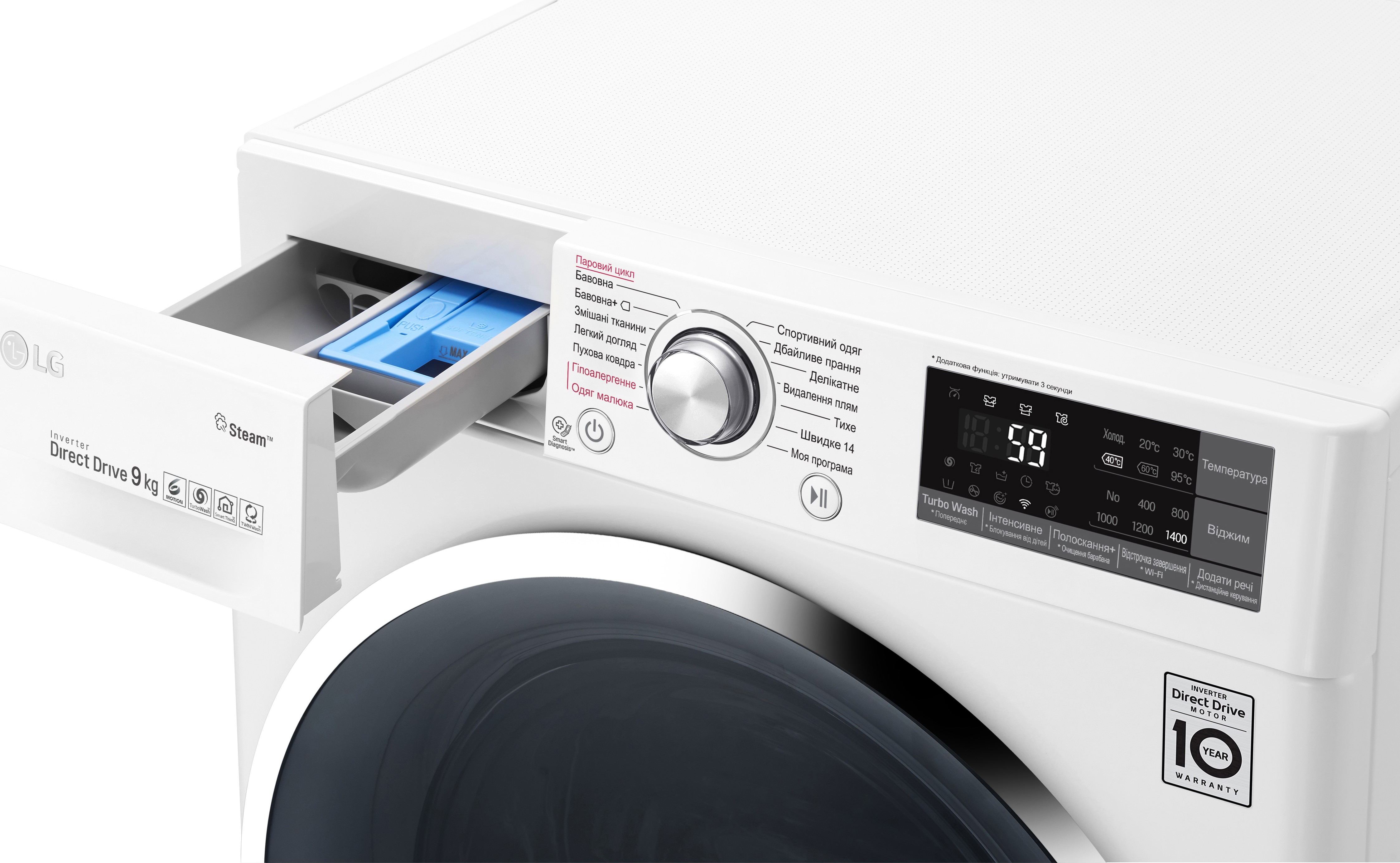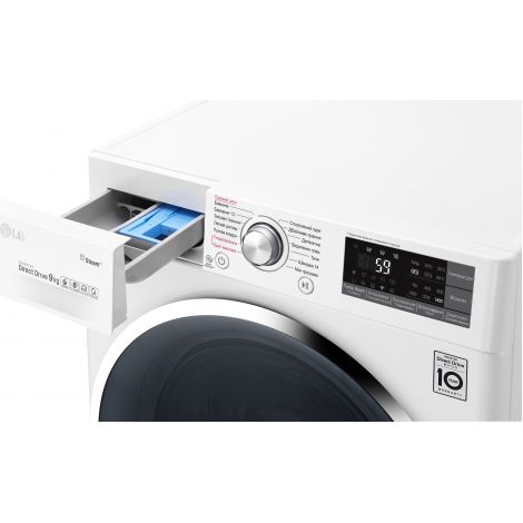 Ожидайте меньше, успевайте больше Технология TurboWash очищает одежду быстрее. Функция JetSpray равномерно разбрызгивает чистую воду на одежду. Благодаря этому цикл Полоскание стал еще более эффективным. 6 motion - 6 движений заботы В отличие от обычных стиральных машин, барабан LG имеет широкий набор вариантов вращения, максимально адаптированных к различным типам ткани и степени загрязнения белья. Inverter Direct Drive Система LG Inverter Direct Drive повышает эффективность двигателя путем отказа от ремня и шкива, а также инверторной технологии, помогает снизить потребление электроэнергии и обеспечивает большую надежность машины. Эта упрощенная система также помогает уменьшить уровень шума. WiFi Благодаря технологии подключения к WiFi, Вы сможете стирать вещи в любое время, находясь в любом месте. Загружайте дополнительные циклы стирки, а также легко диагностируйте неисправности с помощью функции SmartDiagnosis.