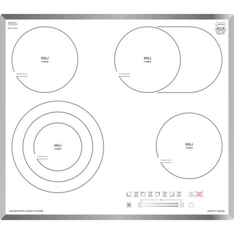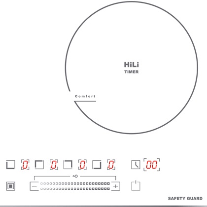 ОПИСАНИЕ КОНФОРОК 2 ? O 16,5 см – 1,2 кВт/ 1 ? O 12,0 / 17,5 / 23,0 см (0,8 / 1,6 / 2,3 кВт) – Тройная зона нагрева /1 ? O 16,5 / 16,0 ? 27,0 см (1,1 / 2,0 кВт) – Расширяемая зона нагрева
