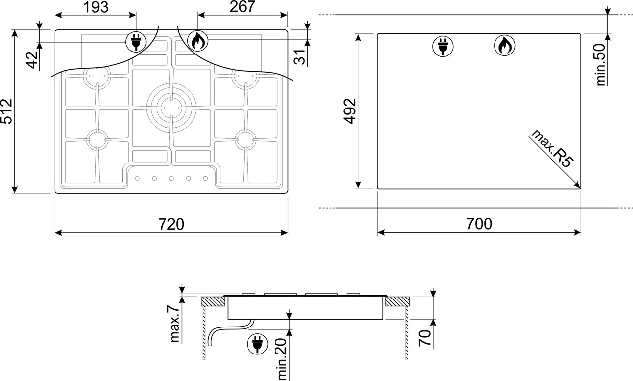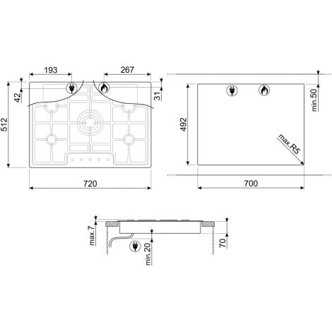 Газовая варочная панель, 72 см, нержавеющая сталь, низкий монтаж с бортиком 3 мм.