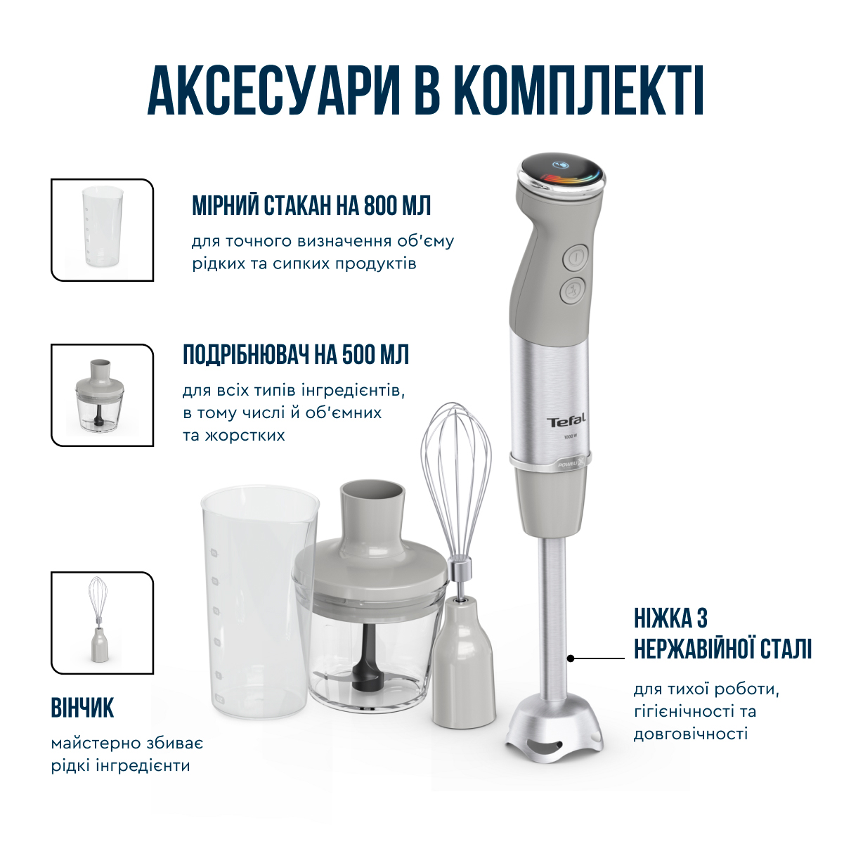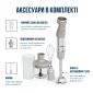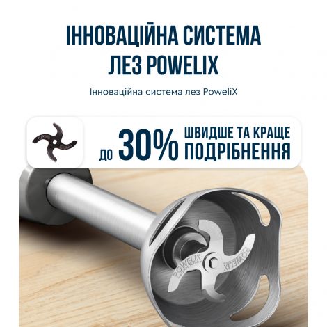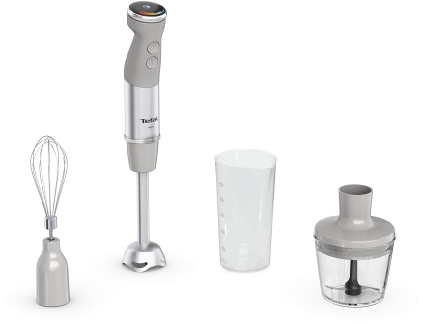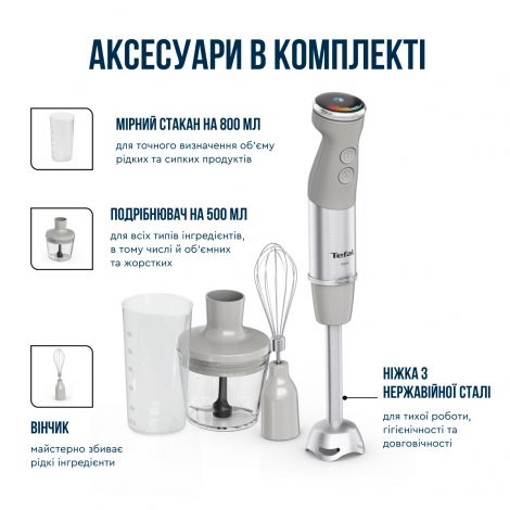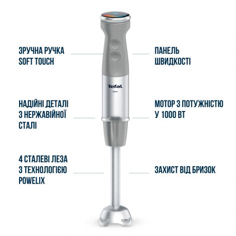 Ручний блендер Quickchef+ від Tefal забезпечує виняткову продуктивність. Ексклюзивна технологія Powelix забезпечує вражаючу гладкість, і може прискорювати роботу на 30%, для отримання кремоподібних і рівних текстур - навіть з найтвердіших інгредієнтів! Відкрийте для себе сучасний прилад, що забезпечує зручне подрібнення без розбризкування: з ергономічною ручкою з м'яким покриттям, міцним металевим корпусом, захистом від розбризкування та багатьма іншими перевагами. Отримайте більше, ніж очікуєте з новим заглибним блендером Quickchef+ HB673B30. Поєднання потужності, швидкості та різноманітних аксесуарів дають можливість втілювати в життя будь-які кулінарні ідеї. Ексклюзивна технологія лез Powelix та потужний мотор 1000 Вт допоможуть досягти ідеальної текстури ваших страв. Використовуйте один із 20 доступних режимів, щоб працювати з найрізноманітнішими інгредієнтами. Потужність 1000 Вт Висока потужність дозволяє швидко та результативно працювати з твердими інгредієнтами. Насолоджуйтесь бездоганною текстурою сумішей під час приготування навіть найскладніших рецептів. Інноваційна система лез PoweliX Покращена ефективність змішування інгредієнтів та до 30% швидше подрібнення з іще більш однорідною текстурою. Ідеальна консистенція ваших страв без зайвих зусиль. Панель швидкості Перемикайте швидкості безпосередньо під час роботи, без необхідності вимикати пристрій. Інтуїтивно зрозуміле управління та 20 режимів + Turbo режим дають змогу легко та точно керувати всіма процесами. Тихий режим — мінімум шуму Особливий режим вдвічі зменшує гучність роботи приладу без втрати ефективності. Блендер замішує інгредієнти на низькій швидкості, готуючи бездоганне тісто для млинців, а також супи чи смузі. Місткий подрібнювач об’ємом 500 мл з надзвичайно гострими лезами допоможе вам впоратися з найскладнішими завданнями й зекономить час. Вимірюйте об’єм рідини чи сипких продуктів в декілька рухів із допомогою зручного й точного мірного стакана на 800 мл. Зберігайте ідеальну рецептуру ваших кулінарних шедеврів. Зручна насадка, що стане надійним помічником у приготуванні пухких омлетів, безе, соусів та навіть тіста для млинців. Металева ніжка із захистом від бризок Особлива конструкція занурювальної ніжки зменшує шум та вібрацію осі, а її нижня форма, що захищає інгредієнти від розбризкування, дарує абсолютний комфорт під час використання. Анатомічна форма ручки в поєднанні з фірмовим покриттям Soft Touch роблять процес приготування не тільки ефективним, а й справді зручним. Єдність двох рішень дарує надійну фіксацію пристрою у руці, запобігаючи ковзанню. Легкий догляд Завдяки простоті конструкції та знімним деталям догляд за пристроєм не спричинює жодних труднощів. Насадки можна очищувати як вручну, так і в посудомийній машині.