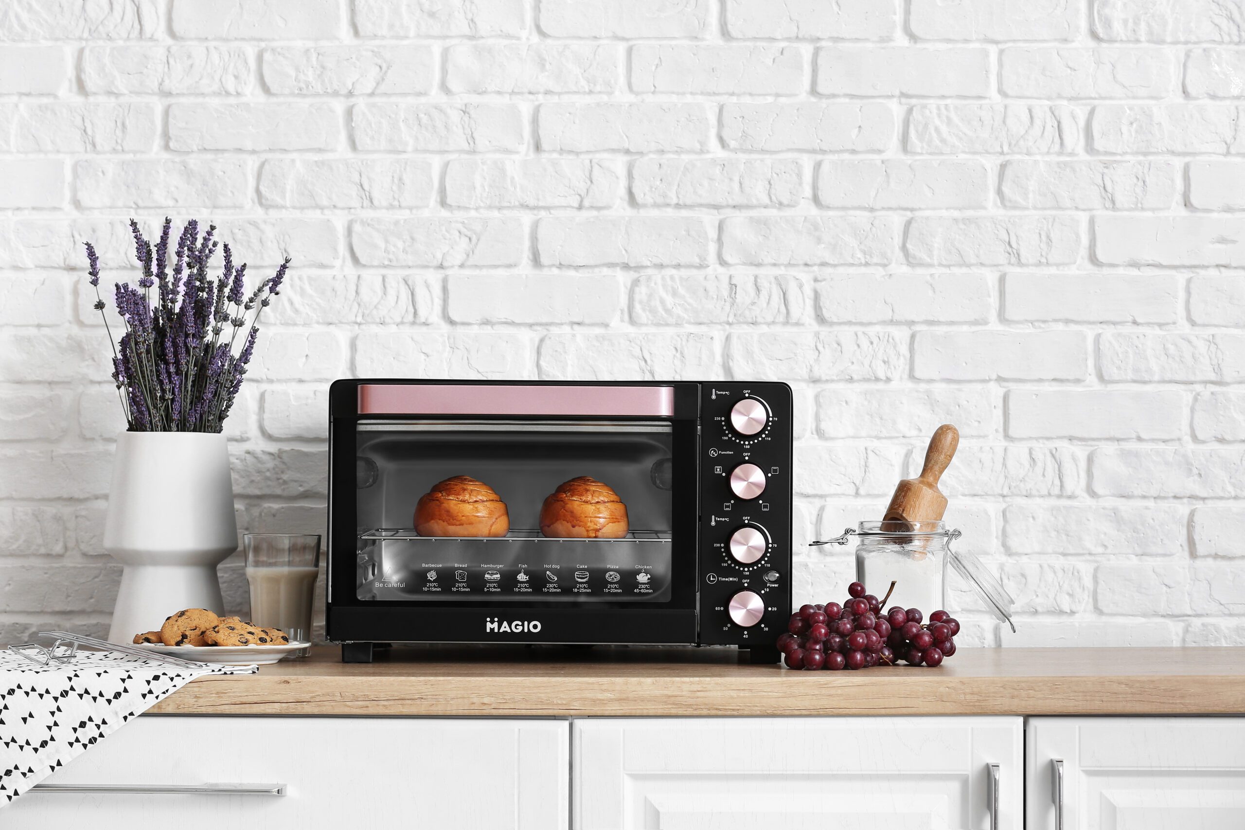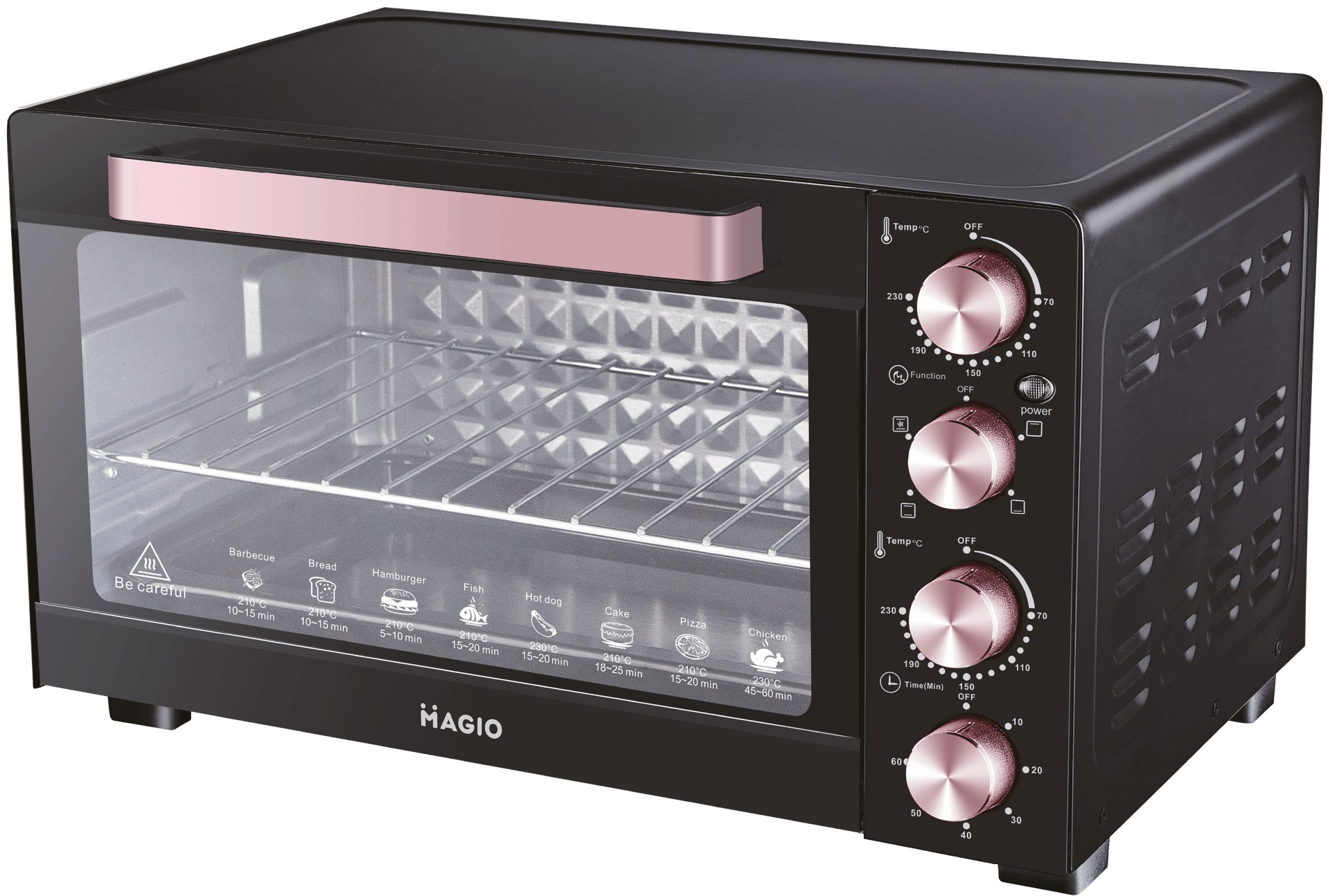 Компактна електропіч MG-249 потужністю 1500 Вт забезпечує оптимальний результат приготування. Внутрішній об’єм складає 33 літри, чого цілком вистачить, якщо ви плануєте готувати страви для своєї родини. 6 автоматичних режимів дозволяють готувати безліч найрізноманітніших страв. Прилад оснащений регулятором температури 70-230°С і таймером на 60 хвилин. Режим конвекції рівномірно розподіляє тепло всередині приладу, піч працює як конвекційна духовка. У комплекті є все необхідне для готування: піддон, знімна решітка, знімна ручка.