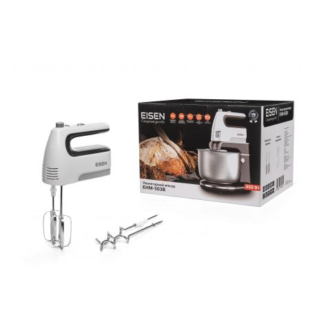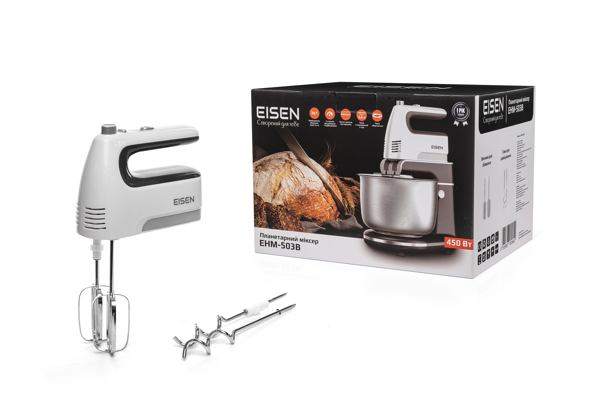 Планетарний міксер EISEN EHM-503B: ваш ідеальний помічник на кухні Шукаєте міцний і надійний кухонний помічник, який допоможе вам приготувати будь-які страви? Планетарний міксер EISEN EHM-503B - це те, що вам потрібно! Міцний та надійний Міксер виготовлений із високоякісних матеріалів, які забезпечують його довговічність. Міксер має потужність 450 Вт, що дозволяє йому легко справитися з будь-якими завданнями. Різноманітні можливості Міксер має 5 швидкостей та турбо режим, що дозволяє вам регулювати потужність відповідно до ваших потреб. Завдяки цьому ви зможете швидко збити легкі збиті вершки або приготувати густе тісто для піци. Комплектація У комплекті з міксером йдуть три насадки: Вінчки - для збивання яєць, вершків, крему та інших легких продуктів. Гаки для тіста - для замішування дріжджового, пісочного та інших видів тіста. Чаша з нержавіючої сталі об’ємом 3,5 л. Безпечний та зручний Міксер оснащений захистом від перегріву, що запобігає його пошкодженню. Також міксер має зручну ручку, яка дозволяє легко його переносити. Планетарний міксер EISEN EHM-503B - це ідеальний вибір для тих, хто хоче приготувати смачні страви швидко та легко.