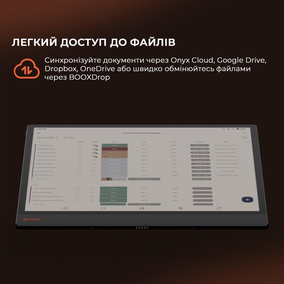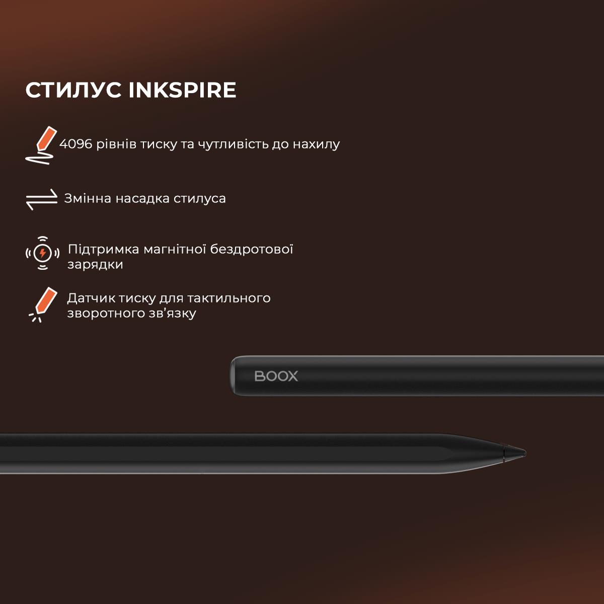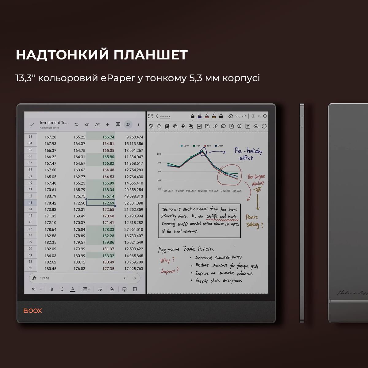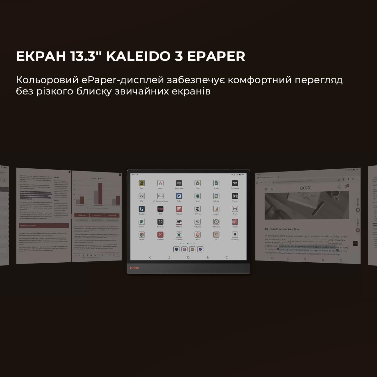 BOOX Tab XC – це 13,3-дюймовий кольоровий електронний рідер, заснований на високопродуктивній апаратній платформі та з широкими можливостями роботи з документами. Модель має сенсорний екран E Ink Kaleido 3 з фронтальним підсвічуванням та регулюванням колірної температури, а також подвійним сенсорним керуванням. Ємнісний датчик дозволяє зручно керувати пристроєм, а індуктивний датчик дає можливість робити малюнки та рукописні нотатки. Модель базується на потужному 8-ядерному процесорі та 6 ГБ оперативної пам’яті. Новий графічний процесор з технологією BOOX Super Refresh забезпечує швидке оновлення екрана та плавний рух об’єктів на екрані. Tab XC ідеально підходить не тільки для читання, але й для роботи з різними типами документів, включаючи кольорові зображення. Операційна система Android 13 дозволяє встановлювати та використовувати сторонні програми. Вбудований модуль Wi-Fi надає можливість завантажувати файли з Інтернету та користуватися різними мережевими сервісами, а підтримка Bluetooth дозволяє підключати зовнішні пристрої. 128 ГБ вбудованої пам’яті дає змогу зберігати в пристрої будь-які необхідні електронні книги та документи без будь-яких обмежень. Пристрій виготовлений у легкому та міцному корпусі. Корпус зі сплаву алюмінію та магнію, екран додатково покритий захисним склом. Модель підтримує активний стилус для рукописних нотаток та малюнків. Акумулятор високої ємності 5500 мАг забезпечує тривалий час автономної роботи. Для Tab XC доступні 2 типи чохлів – магнітний чохол та спеціальний чохол із клавіатурою та трекпадом, що підходить для зручного набору тексту. Ці чохли можна придбати окремо. Їх можна використовувати для захисту BOOX Tab XC під час транспортування. Встановлення додатків Тривала робота Підтримка мов та словників Вбудований G-сенсор Пристрій підтримує OTG Інструмент, такий же гострий, як і ваші ідеї Tab XC поєднує цифрову зручність та передові інструменти в надтонкому дизайні товщиною 5,3 мм. Його елегантний, професійний дизайн бездоганно адаптується до будь-якого робочого середовища. Просторий. Барвистий. Приємний для очей Широке, барвисте полотно забезпечує комфортний перегляд, позбавлене різкого відблиску традиційних екранів. Його ніжні, природні відтінки роблять перегляд, читання та виконання мультимедійних завдань легкими та приємними. Чуйний. Потужний Tab XC плавно переходить між роботою та особистим життям завдяки своєму вдосконаленому восьмиядерному процесору та 6 ГБ оперативної пам’яті. Завдяки технології BOOX Super Refresh? він без зусиль справляється зі складними завданнями та забезпечує плавний перегляд вебсторінок. Це кольоровий планшет на електронному папері По суті, це центр продуктивності, який забезпечує надійну роботу для щоденних завдань, зменшує навантаження на очі та мінімізує відволікаючі фактори. Тільки те, що вам потрібно Маючи доступ до Google Play Store та 128 ГБ пам’яті, ви можете завантажувати потрібні вам програми. Налаштуйте свій робочий процес, щоб зробити його унікальним. Створіть цілеспрямований робочий простір Насолоджуйтесь перевагами технологій, не перериваючи їх рекламою та нескінченним гортанням стрічок. Розумні інструменти для письма Легко розробляйте ідеї, переглядайте документи або перетворюйте грубі каракулі на вишукані форми, виділення та підкреслення за допомогою інструментів Smart Scribe. Завдяки 