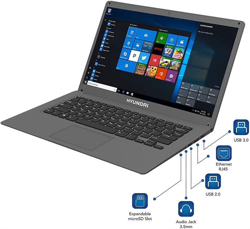 Ноутбук Hyundai Thinnote-A має вбудований 2,5-дюймовий слот для жорсткого диска та слот Micro SD, що дозволяє значно розширити ваше сховище і вирішити питання зберігання електронних книг, пісень, відео, фотографій, музики та інших файлів.