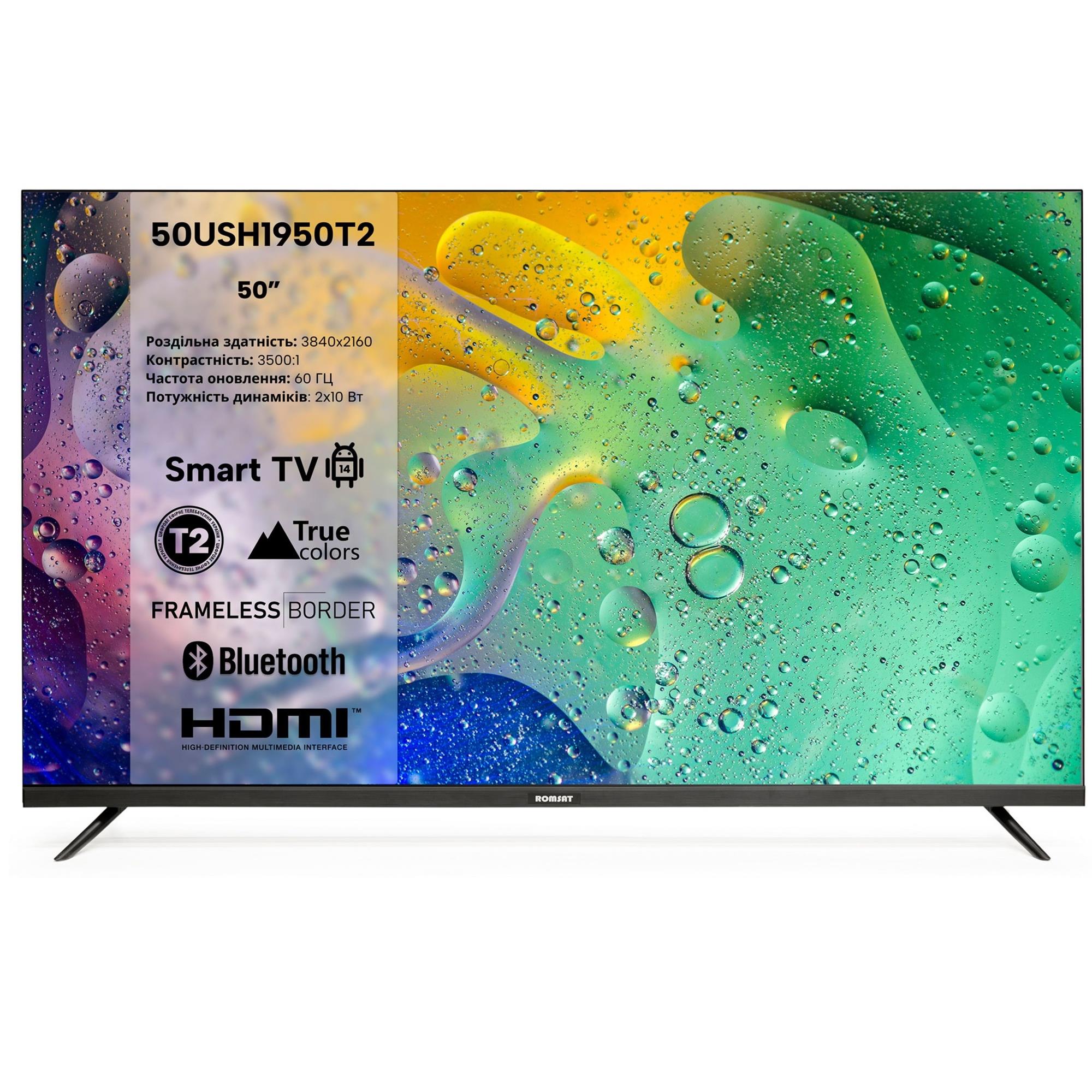 Romsat 50USH1950T2: Ідеальний баланс якості та функціоналу Пориньте у світ розваг із Romsat 50USH1950T2 — 50-дюймовим телевізором, який поєднує в собі елегантний дизайн, передові технології та інтуїтивно зрозуміле керування. Це ідеальне рішення для тих, хто шукає якісний смарт-телевізор для дому. Чітке зображення та сучасний дизайн Насолоджуйтеся улюбленими фільмами та іграми з хорошою деталізацією. Завдяки безрамковій технології, Romsat 50USH1950T2 створює ефект повного занурення, перетворюючи вашу кімнату на справжній кінотеатр. Якість 4K Ultra HD з технологією HDR: Роздільна здатність 3840x2160 забезпечує кришталево чисту картинку, а VA-матриця з контрастом 3500:1 — глибокі чорні та яскраві кольори. Кожен кадр виглядає максимально реалістично. Широкий кут огляду: Кут огляду 178° гарантує, що зображення буде чітким, незалежно від того, з якої частини кімнати ви дивитеся. Стильне доповнення: Мінімалістичний дизайн та майже непомітні рамки гармонійно вписуються в будь-який інтер’єр. Ви можете встановити телевізор на стійкі ніжки або закріпити на стіні за допомогою кронштейнів VESA: 140x300 мм. Розумні можливості з Android 14 Операційна система Android 14 та потужний 4-ядерний процесор відкривають безмежні можливості для розваг. Ви швидко отримаєте доступ до улюбленого контенту та програм. Швидкий доступ: Вбудований Wi-Fi та веб-браузер дозволяють легко переглядати фільми, спілкуватися в соцмережах, грати в ігри або дивитися YouTube. Зручне підключення: Передавайте фото та відео зі свого смартфона на великий екран за допомогою технології Wi-Fi Display або під’єднуйте бездротові навушники чи акустику завдяки Bluetooth 5.2. Чудовий звук та різноманітність портів Потужний звук: Два вбудовані стереодинаміки по 10 Вт забезпечують чистий та об’ємний звук, що ідеально доповнює візуальний ряд. Універсальне підключення: Завдяки широкому набору портів, ви легко під’єднаєте будь-які пристрої: 3 x HDMI для ігрових консолей та плеєрів. 2 x USB для перегляду контенту з флешок. Вбудовані тюнери DVB-C/DVB-T/DVB-T2/DVB-S2 для перегляду ефірного, кабельного та супутникового ТБ. RJ45, AV IN, виходи на навушники та оптичний вихід для максимальної гнучкості. Romsat 50USH1950T2 — це ваш крок у світ якісних та розумних розваг.
